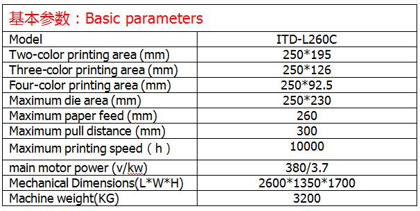 Basic configuration (standard) 1, two, three, four-color printing on the plate, rubber roller, iron core each set 2, a number box 3, a set of standard tools 4, printing the bottom plate, die cutting the upper and lower plates 5. One paper feeder and one paper cutter 6, suction device Optional function device: 1. bronzing device (direct hot / cross); 2. independent UV drying system; 3. rewinding device Punching device (mechanical type) Materials used: self-adhesive, tag, protective film, ribbon, aluminum foil and other packaging materials Standard features: automatic paper feeding, printing, laminating, die cutting, scrapping, cutting